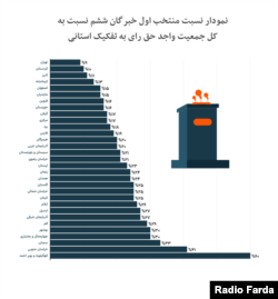 اما نمودار بعدی نسبت رأی منتخب اول هر استان نسبت به کل جمعیت واجدان حق رأی در آن استان را بر اساس آمار اعلامی از سوی وزارت کشور و استانداریها نمایان میسازد. باید توجه کرد که رأی کسب شده توسط منتخب اول به کل کسانی که میتوانستند رأی بدهند، شامل شرکتکنندگان، آرای سفید و باطله و تحریمیها، تقسیم شده است؛ نه آرای مأخوذه.